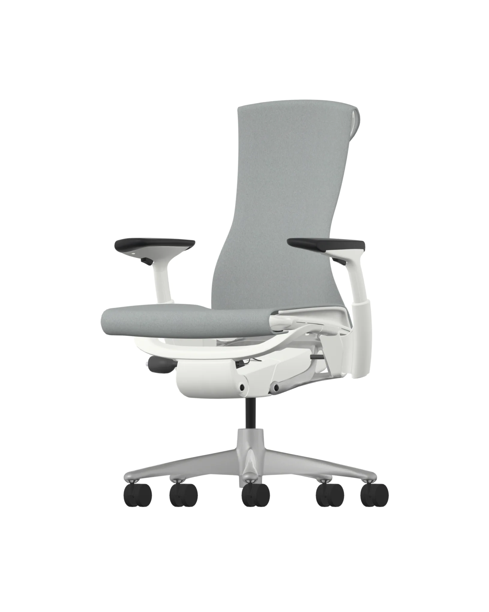 De Herman Miller Embody met wit frame en Dark Mineral Sync-bekleding straalt een verfijnde lichtheid uit. De zachte, lichtgrijze tint voelt modern en fris aan, als de koele schaduw van ochtendmist op een heldere dag. Het witte frame versterkt deze elegante eenvoud en geeft de stoel een open, luchtige uitstraling die perfect past in minimalistische of eigentijdse interieurs.